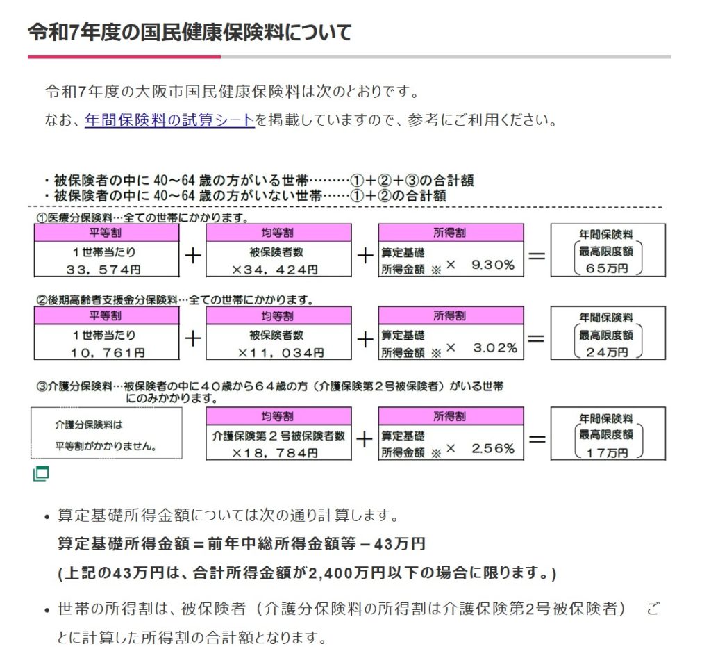 大阪市の国民健康保険料については、大阪市のホームページに情報が集約されています。