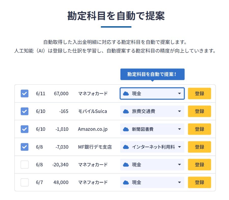 項目によっては、勘定科目を覚えさせて、データを取り込んだ時点で仕訳が完成出来るので、更に効率が上がります。