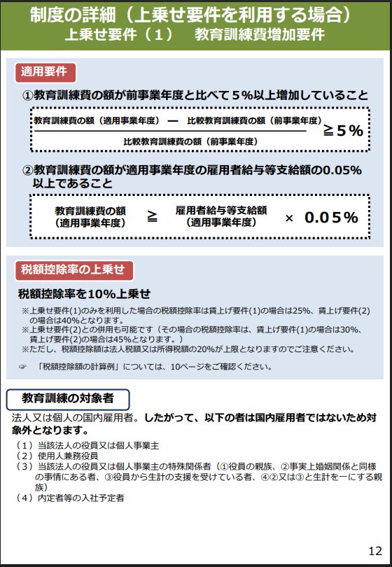 ここまでの賃上げ促進税制の適用要件を満たしていることを確認した上で、研修等の教育訓練費の金額が一定割合以上であれば、給与等支給額の増加額に乗じる割合を上乗せすることが出来ることになります。