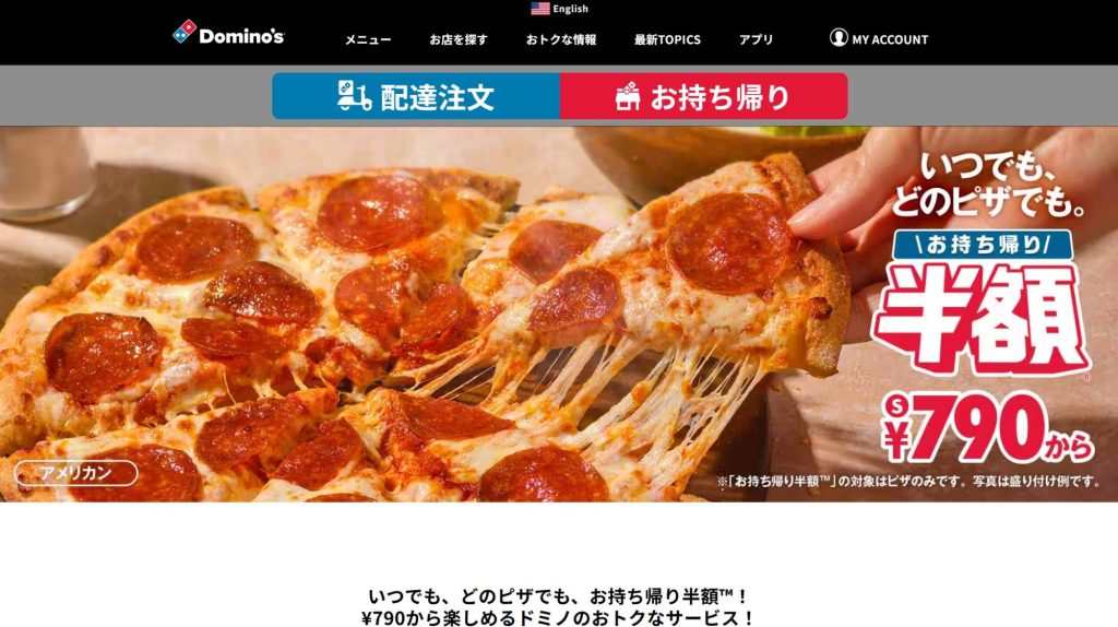 ドミノピザであれば、デリバリーではなく、テイクアウトを選べば、ピザが半額になるという特典があります。