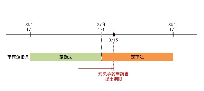 例えば、X7年から車両運搬具の償却方法を定額法→定率法に変更したい場合。