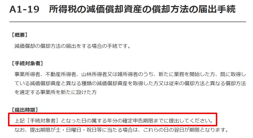 新たに事業を始める場合など、これから減価償却資産の減価償却を始める場合には、その年の確定申告の提出期限までに手続きをする必要があります。