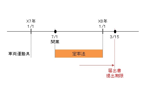 例えば、X7年7月1日開業で、車両運搬具の償却方法を定率法にしたい場合。