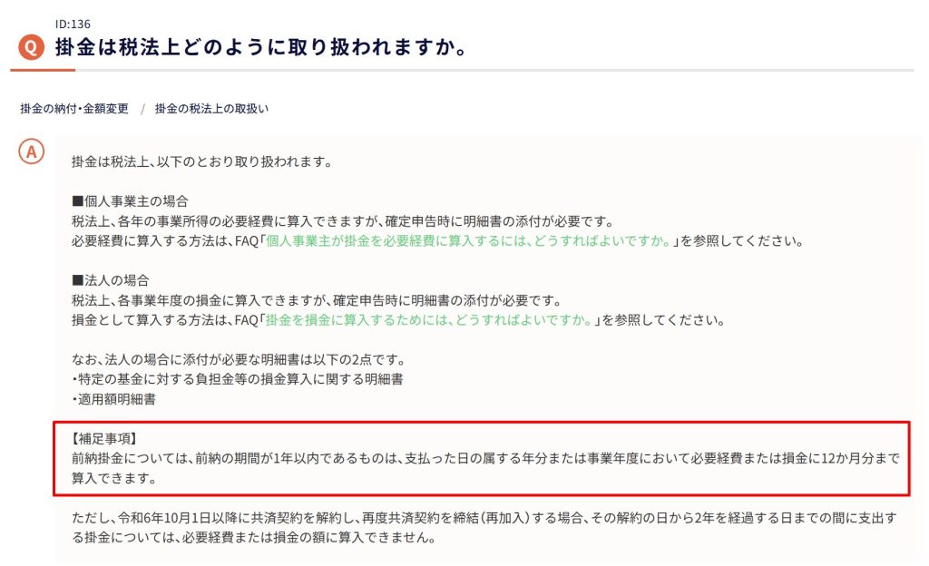基本的には、支払った掛金が経費となるので、前納した掛金でも支払った年度の経費とできる場合があります。